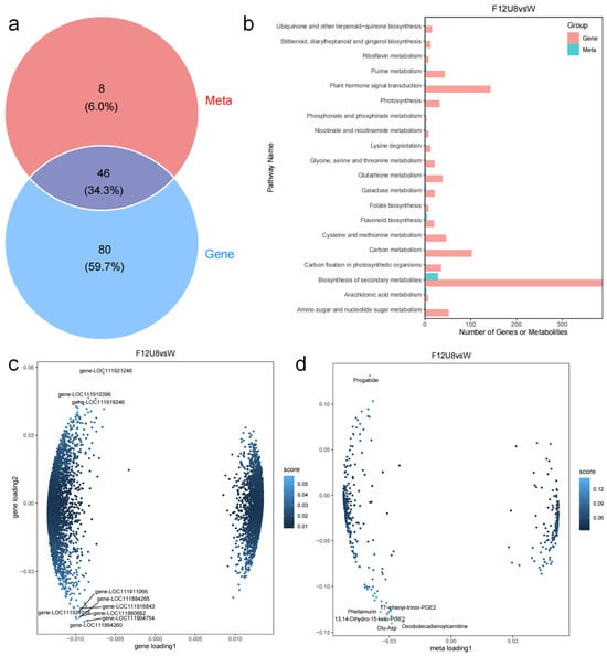 Figure 11. Joint analysis of transcriptome and metabolome. (a) Venn analysis of transcriptomics and metabolomics; (b) KEGG enrichment analysis of transcriptomics and metabolomics; (c) Loading of genes based on O2PLS analysis; (d) Loading of metabolites based on O2PLS analysis.