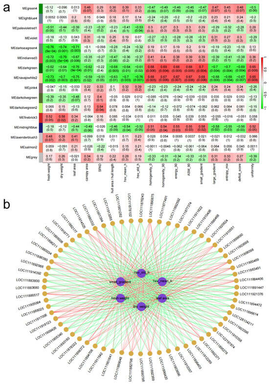 Figure 12. Joint analysis of transcriptome and phenotype based on WGCNA. (a) Correlation network diagram between gene modules and phenotypes. (b) The correlation network analysis of key gene modules and representative phenotypic traits in WGCNA.