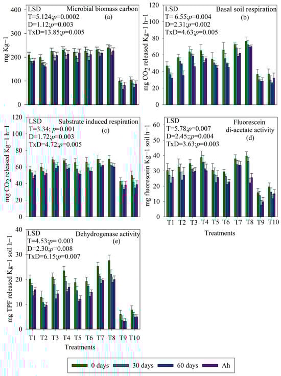 Microbial biomass carbon (MBC) is an intrinsic component of organic matter; a decrease in MBC may profoundly impact the balance of nutrients and mineral availability for plants [40]. The treatment-wise soil MBC showed periodic reduction up to 60 days considering the growing phase of rice, but an elevated MBC rate was observed after crop harvesting. The significantly highest soil MBC was detected on day 0, irrespective of treatments. The addition of organic matter, like cow dung or vermicomposted steel slag, significantly (p treatment = 0.0002; LSD = 5.124) increased the treatment-wise soil MBC in contrast to control plot treatments and plots with sole chemical fertilizer shown in Figure 1a. According to Chakraborty et al. [8], the addition of different organic substrates showed similar outcomes. Higher MBC content and elevated microbial activity were often found in soil systems that receive more organic matter [41]. The plots applied with sole chemical fertilizers tend to have elevated MBC when compared to control plots. The proliferation of microorganisms due to the presence of heavy roots might have resulted in increased MBC in a chemically amended plot. Combining chemical fertilizers with organic vermicomposted steel waste slag and cow dung resulted in higher MBC compared to a single application. During this study period, treatment-wise, the highest soil MBC was observed in treatment T8, followed by treatment T4. Previous reports by Bhattacharya et al. [42] revealed similar results when a combination of organic and inorganic fertilizers was applied. Chemical fertilizers can meet the nutritional demand of microbes, but they cannot fulfill their carbon requirement. Interestingly, the combined application of organic and inorganic amendments balances the nutritional demand and also fulfills their carbon requirements. This was reflected in terms of increased levels of soil MBC in treatments T4 and T8. The periodic decline in soil MBC from different treatments could be attributed to the adverse impact of the waterlogged condition of rice crops. These observations can be supported by earlier reports [43,44]. In contrast, after harvesting, rice crops are prohibited from waterlogging stress, and the leftover root mass in the soil turns out to be another substrate for microorganism proliferation.