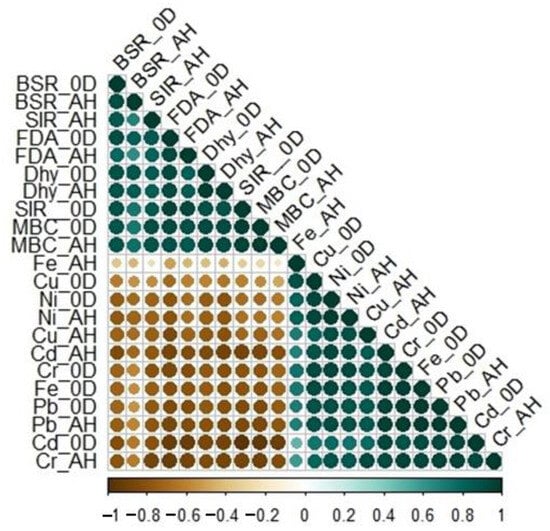 Correlation plots based on interactions between bioavailable HM (Cr, Ni, Cd, Fe, Pb, Cu) fractions and microbial parameters (MBC, BSR, SIR, FDA, DHA). Here, 0D: 0 day and AH: after harvest.