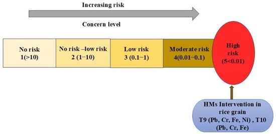 The threat to human life from the ingestion of food material exposed to HMs in day-to-day life was evaluated using risk thermometers [16,64]. The potential threat of rice grain is depicted in Table S1. The risk thermometer, as shown in Figure 4, evaluates the presence of HMs in grains of treatment T9 and T10. The results indicate (class 5) the dietary risk of raw rice grain from treatment T9 and T10 for humans [T9Cr SAMOE: 6.11 × 10−3, T9Ni SAMOE: 9.69 × 10−3, T9Pb SAMOE: 8.14 × 10−3, T9Cu SAMOE 1.87 × 100, T9Fe SAMOE: 6.79 × 10−4; T10Cr SAMOE: 7.99 × 10−3, T10Ni SAMOE: 1.01 × 10−2, T10Pb SAMOE: 8.24 × 10−3, T10Cu SAMOE: 1.21 × 100, T10Fe SAMOE: 7.09 × 10−4]. The SAMOE-TCR of rice grains were T9 SAMOETCR Cr: 7.20 × 10−7, T9 SAMOETCR Ni: 2.6 × 10−6, T9 SAMOETCR Pb: 4.61 × 10−8; T10 SAMOETCR Cr: 5.60 × 10−7, T10 SAMOETCR Ni: 2.43 × 10−6, T10 SAMOETCR Pb: 4.55 × 10−8. The above findings reveal that the consumption of rice from steel slag-amended waste content HMs can lead to severe health conditions.