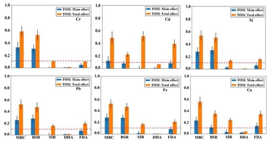 The Sobol indices were utilized to analyze variance and ascertain the relative effect of each important input, as well as to elucidate its interaction with the model output, particularly regarding variance [18]. These indices for all input variables were used to assess the effect of bioavailable potential HM fractions on soil microbial dynamics in rice. The analysis includes both the first-order sensitivity index (FOSI) and the total-order sensitivity index (TOSI). The observed index values of FOSI and TOSI for input parameters MBC and BSR were higher in the presence of HMs like Pb, Cr, Fe, Ni, and Fe. Whereas for Cd, the TOSI effect was observed maximum for input parameters SIR and MBC, as shown in Figure 5. Among all the input parameters, DHA showed the least FOSI and TOSI effects. HMs like Cd and Cu indicated a TOSI effect between 0.2 and 0.4. These findings imply that steel waste slag has a considerable deleterious influence on soil microbial health. The presence of these HMs affects soil robustness by affecting parameters like MBC, BSR, and SIR, particularly if it is disposed of in nearby farming regions without proper depuration [28].
