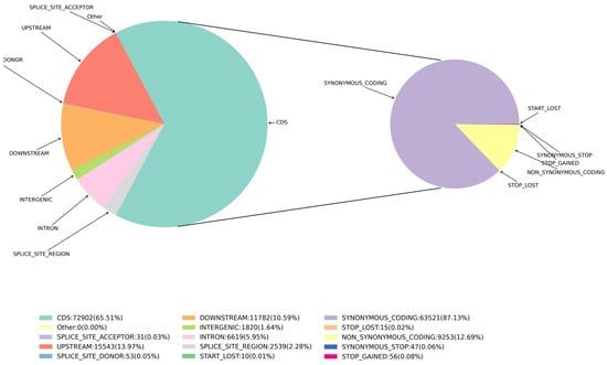 SNP proportions at different genomic locations: INTERGENIC represents intergenic regions, INTRON represents intronic regions, CDS represents coding sequence regions, UPSTREAM/DOWNSTREAM represent SNP sites located within 5 kb upstream/downstream of genes, UTR_5_PRIME/UTR_3_PRIME represent SNP sites in the 5′ UTR and 3′ UTR of genes, SPLICE_SITE_ACCEPTOR/SPLICE_SITE_DONOR represent splice site mutations (within the first 2 bp of an exon), SPLICE_SITE_REGION represents splice site region mutations (1−3 bp variation in exons or 3−8 bp variation in introns), START_GAINED represents gained start codons (in non-coding regions). SNP mutation types within CDS regions annotation: START_LOST represents lost start codons, SYNONYMOUS_START/NON_SYNONYMOUS_START represent synonymous/non-synonymous start codon mutations, SYNONYMOUS_CODING represents synonymous coding mutations, NON_SYNONYMOUS_CODING represents non-synonymous coding mutations, STOP_GAINED/STOP_LOST represent gained/lost stop codons.