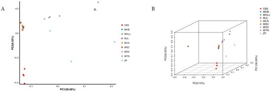 PCA analysis illustrated the clustering pattern of the samples, confirming the results of the phylogenetic analysis (Figure 3, Table S1). The two-dimensional plot of PC1 and PC3, as well as the three-dimensional plot of PC1, PC2, and PC3, depicted the spatial distribution of each strain based on genetic variation. PC1 accounted for 36.58% of the variation, PC2 explained 12%, and PC3 accounted for 6.52%. The analysis revealed four distinct clusters among the strains. With the exception of ZP1 and ZP5, most strains and CBS3 formed a cohesive group characterized by PC1 values ranging from 0.2125 to 0.2122, closely matching the branches observed in the phylogenetic tree. Strains such as WYN8, WYN7, WYN3, WYN4, and WYN2 exhibited PC1 values between 0.1507 and 0.1368, while ZP5, ZP13, WYN6, ZP1, WSC5, WYN5, WYN1, and WSX ranged from 0.0505 to 0.0491, aligning closely with branches in Clusters I and II in the phylogenetic tree.