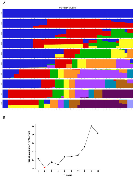 Population structure at different K values. (A) shows the clustering results for K values ranging from 1 to 10. (B) illustrates the clustering of the research population with the number of subgroups (K value) preset from 1 to 10, followed by cross-verification of the clustering results. The optimal number of clusters is determined by identifying the valley in the cross-validation error rate.