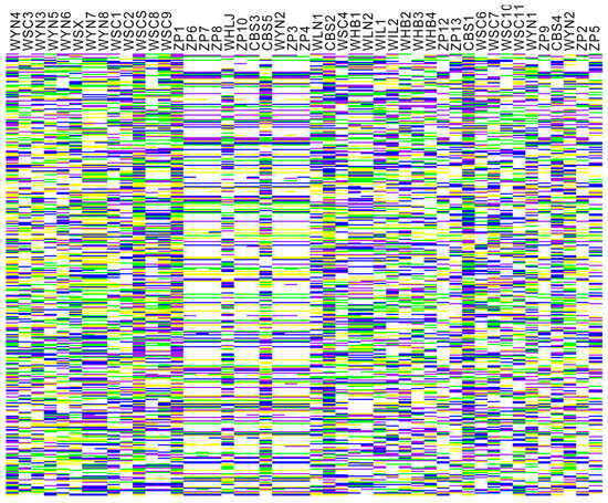 In the analysis, all selected high-quality SNP markers were used for population genetic analysis. MEGA X software [25] was applied to construct phylogenetic trees for each sample using the neighbor-joining method with the p-distance calculation model and 1000 bootstrap replications. Population genetic indicators were calculated using VCFtools (v0.1.15) [26]. Admixture software assessed population structure [27], while EIGENSOFT [28] performed principal component analysis to cluster the samples. Genetic diversity analysis was conducted using PLINK software [29]. A DNA fingerprint was created to identify markers suitable for genetic typing based on specific criteria: markers were evenly distributed across the genome, exhibited 100% completeness (no missing data), had a minor allele frequency (MAF) above 20%, a polymorphic information content (PIC) above 0.35, conformed to Hardy–Weinberg equilibrium (p-value > 0.01), and showed no nearby mutations within 100 bp of the marker [30].