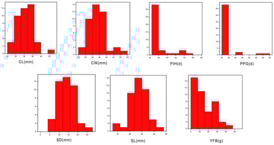 Histograms showing the frequency distribution of 7 agronomic traits. The x-axis represents the value range of the traits, while the y-axis indicates the frequency. The top left to the bottom right are the frequency distribution histograms of cap length (CL), cap width (CW), the period from inoculation to harvesting (PIH), the period from inoculation to primordia generation (PPG), stipe diameter (SD), stipe length (SL), and yield of fruiting body per bottle (YFB).