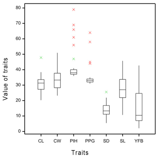 Boxplots describing the variation in each trait. The line inside the box represents the median, the whiskers extend to the minimum and maximum values. Red Crosses indicate outliers. The y-axis indicates the value range of agronomic traits, while the x-axis represents traits, from left to right are cap length (CL), cap width (CW), the period from inoculation to harvesting (PIH), the period from inoculation to primordia generation (PPG), stipe diameter (SD), stipe length (SL), and yield of fruiting body per bottle yield per bottle (YFB).