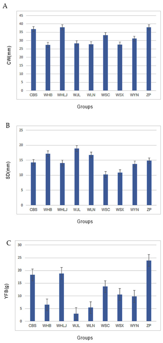 Variations among groups in agronomic traits: (A) variations among groups in cap width (CW); (B) variations among groups in stipe diameter (SD); (C) variations among groups in the yield of fruiting body per bottle (YFB). The x-axis represents different groups, and the y-axis represents the range of trait values.