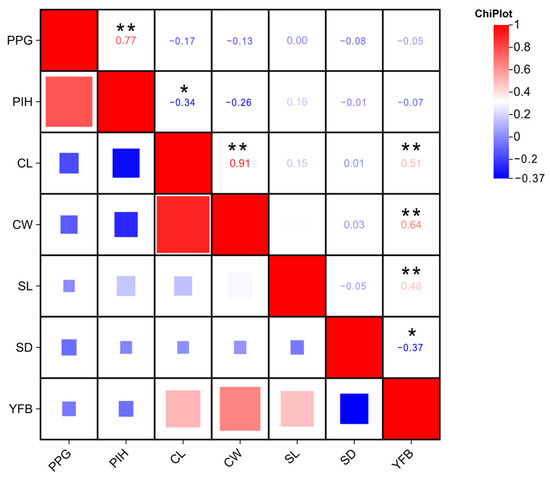 Phenotypic correlation analysis heat map. From top to bottom and left to right, are in the same order, corresponding to the period from inoculation to primordia generation (PPG), period from inoculation to harvesting (PIH), cap length (CL), cap width (CW), stipe length (SL), stipe diameter (SD), and yield of fruiting body per bottle yield per bottle (YFB). Sample size = 42; * and ** indicate the significance at 0.05 and 0.01 level, respectively.
