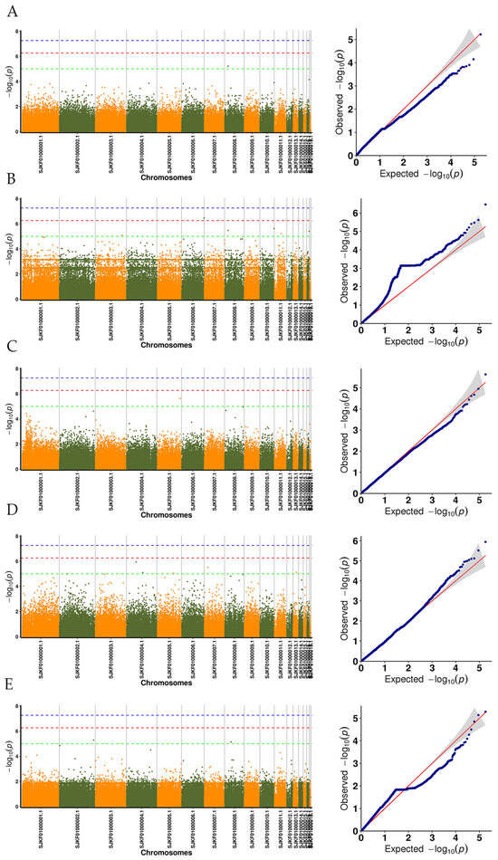 Manhattan plot (left) and quantile–quantile (Q-Q) plot (right) of SNP p-values in the whole population. In the Manhattan plot, y-axis presents the observed SNP −log10(p) and x-axis the SNP positions across the 20 scaffolds. Horizontal lines show the genome-wide significant threshold; the green dashed line represents the value of −log10(p) = 5. In the Q-Q plot, the y-axis and x-axis represent the observed SNP –log10(p) and expected –log10(p), respectively. From top to bottom: (A) cap length (CL), (B) cap width (CW), (C) stipe diameter (SD), (D) stipe length (SL), and (E) yield of fruiting body per bottle yield per bottle (YFB).