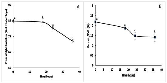 During germination, the fresh weight of the scutellum remained stable, with a value that fluctuated around 84% of the total weight of the embryo between 0 and 18 h after the start of imbibition. As time progressed, the contribution of the scutellum to the total fresh weight of the embryo decreased to a minimum value at 36 h, and this change was statistically significant (Figure 1A). The amount of soluble protein is relative to fresh weight, which decreased from 0 h to 18 h, followed by a greater decrease between 18 and 24 h. Later from this time, the amount of protein remained steady until 36 h, although the differences were not statistically significant (Figure 1B).
