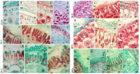 During the transition from germination to the start of seedling growth, the morphology of the scutellar epidermis undergoes changes. At 22 h after imbibition, the epidermis of the scutellum consists of a monostratified layer of polyhedral cells (Figure 2A), which begins to expand and undergoes structural modification (Figure 2B). The cells of the parenchyma in contact with the epidermis are smaller than the cells most internal to the organ (Figure 2C,D). The region of the endosperm exposed to the scutellum consists of dead cells that are compact with variable thicknesses and constitute the fibrous layer (Figure 2B,D) and show that the edge of the domain of the starchy endosperm is in contact with the embryo (Figure 3A); these confirmed the previous findings [51]. At 24 h, the cells of the scutellum epidermis elongate asymmetrically and asynchronously, and the basal region of the scutellum near the radicle presents the largest number of elongated cells (Figure 2E–J). At this time, the smallest cells of the parenchyma were located under to epidermis, whereas the largest cells were located internally and close to the vascular bundles (Figure 2G,H).