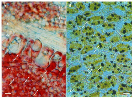 Reserve substances in the scutellum. Histochemical tests of germinated embryo scutellum samples at 24 h of imbibition were stained for the following: (A), lipids were detected via Oil Red O reagent; (B), starch grains were detected using an iodine–potassium iodide solution. Symbols: ec, epidermal cell; fl, fibrous layer; pc, parenchyma cell; se, starchy endosperm; st, starch grain; →, reserve substance. Bar 50 µm: (A,B).
