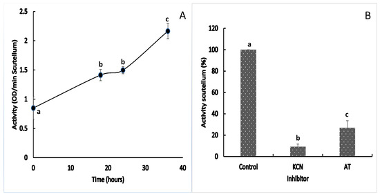 Catalase activity in the maize scutellum. (A) Enzymatic activity in scutellum between 0 and 36 h after the start of imbibition; (B) Effects of the inhibition of KCN and 3-amino-1,2,4-triazole in extracts at 24 h. The values represent the mean ± SE of n = 8 independent assays, and in each test, four scutella were used. ANOVA and Tukey–Kramer multiple-comparison tests were performed, with p < 0.05. Data groups with different letters are significantly different.