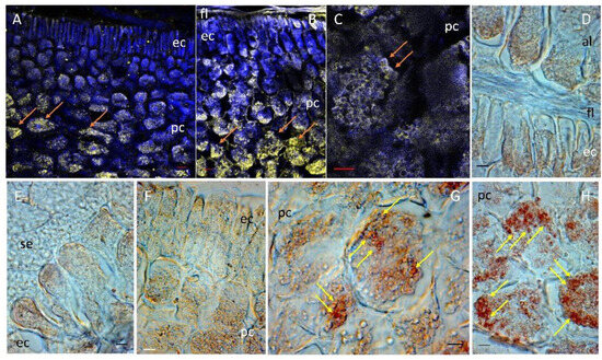 Location of catalase (CAT) in maize scutellum. CAT was detected in the scutellum after 24 h of imbibition using a specific antibody. (A–C) Show the location of CAT by immunofluorescence in yellow. To provide anatomical context, tissue autofluorescence in blue was used. (D–H) Location of CAT by immunohistochemistry in brown. Symbols; al, aleurone layer; ec, epidermal cells; fl, fibrous layer; pc, parenchymal cells; se, starchy endosperm; →, specific location of CAT in yellow or brown depending on the technique used. Bar, (D,E,G). (H): 50 µm; (A,B): 100 µM; (F): 125 µm; (C): 200 µm.