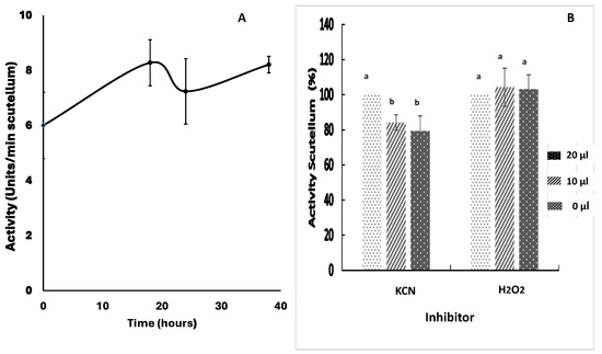 Superoxide dismutase (SOD) activity in maize scutellum. SOD activity was determined in scutellum from embryos germinated from 0 to 36 h. (A) Enzymatic activity in the period of 0 to 36 h of imbibition. (B) Effect of the KCN and H2O2 inhibitors on the enzymatic extract reaction mixtures after 24 h; 10 or 20 µL of a concentrated KCN solution (indicators on the right of the graph) was added to yield a final concentration of 0.3 or 0.6 mM; 10 or 20 µL of H2O2 was added to achieve a final concentration of 0.26 or 0.52 mM. The values represent the mean ± SE of n = 6 independent assays, and in each test, four scutella were used. ANOVA and Tukey–Kramer multiple-comparison tests were performed, with p < 0.05. Data groups with different letters are significantly different.
