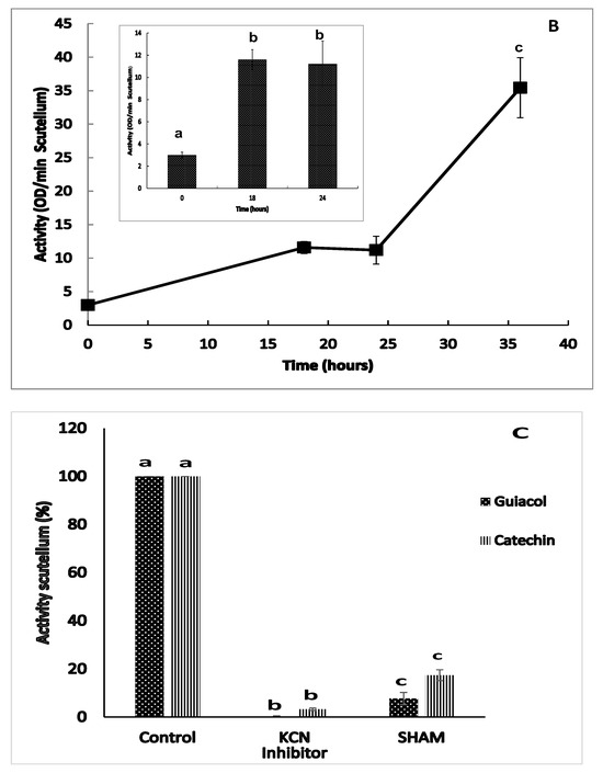The enzymatic activity of class III peroxidase (POX) was detected between 0 and 36 h of imbibition using two substrate mixtures in the presence of H2O2, guaiacol and catechin. When hydrogen peroxide was eliminated from the reaction mixture containing either guaiacol or catechin, no activity was detected in the enzymatic extract in the scutellum of Chalqueño maize, indicating that during this period, only peroxidase activity occurred. The peroxidase activity results revealed that the use of guaiacol + H2O2 (Figure 8B) was superior to the use of catechin + H2O2 (Figure 8A). At 0 h of imbibition, basal activity was observed in the scutellum, which increased towards the end phase of germination (18 h), that is, a 12.4- or 3.8-fold increase with catechin + H2O2 or guaiacol + H2O2, respectively (boxes in Figure 8A,B). The activity at 24 h was similar to that found at 18 h for both reaction mixtures. After 36 h of imbibition, the activity increased, with a proportional 21-fold increase with catechin + H2O2 or 3.1-fold with guaiacol + H2O2 with respect to the value observed at 24 h (Figure 8A,B). The use of inhibitors in extracts at 24 h confirmed that the activity observed was that of class III peroxidase (Figure 8C). In the presence of KCN, the activity decreased by 96.6% with both substrate mixtures, whereas the use of SHAM inhibited 82.6% of the activity with catechin + H2O2 or 92.2% with guaiacol + H2O2.