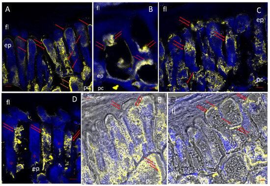 POX was highly enriched at 24 h in both the epidermis and the parenchyma of the scutellum. The expansion of epidermal cells after germination causes them to move towards each other in different planes, and in some of them POX is localized in the middle part and at the apex of those cells (Figure 9A). In the middle of the epidermal cells, fluorescence was detected in small invaginations of the cell surface (Figure 9B). The displacement between the cells caused an alternation in the immunolocalization of POX in the epidermal cells, which allowed us to locate the immunological markers on the cell surface corresponding to the plasma membrane (Figure 9C,D). In addition, POX was also located outside the plasma membrane (Figure 9E), confirming previous findings by our group [51]. The parenchyma adjacent to the epidermis showed an immunolocalization of POX near the periphery of the cells (Figure 9E,F).
