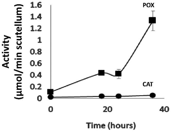 Comparison of class III peroxidase and catalase activities in the scutellum. The enzymatic activity is expressed in mmol/min scutellum using the molar extinction coefficient for guaiacol of ε = 26.6 mM−1 cm−1 for guPOX activity and of ε = 39.4 mM−1 cm−1 for H2O2 consumption in the CAT activity. The values represent the mean ± SE of n = 8 independent assays, and in each test 4 scutella were used. ANOVA and Tukey–Kramer multiple-comparison tests were performed, with p < 0.05. The results indicate significant differences for each time point between the two enzymes (not shown in the figure).