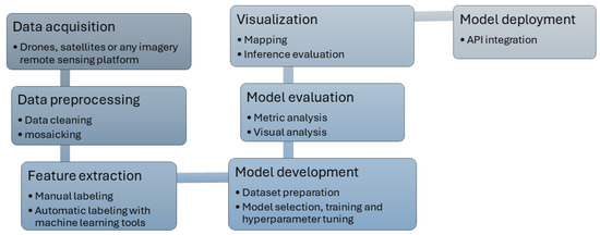 This section will present a succinct description of the techniques used in this research. For illustration, we present Figure 1. This figure shows an example step-by-step process for using remote-sensing data and deep learning to monitor and analyze the environment.