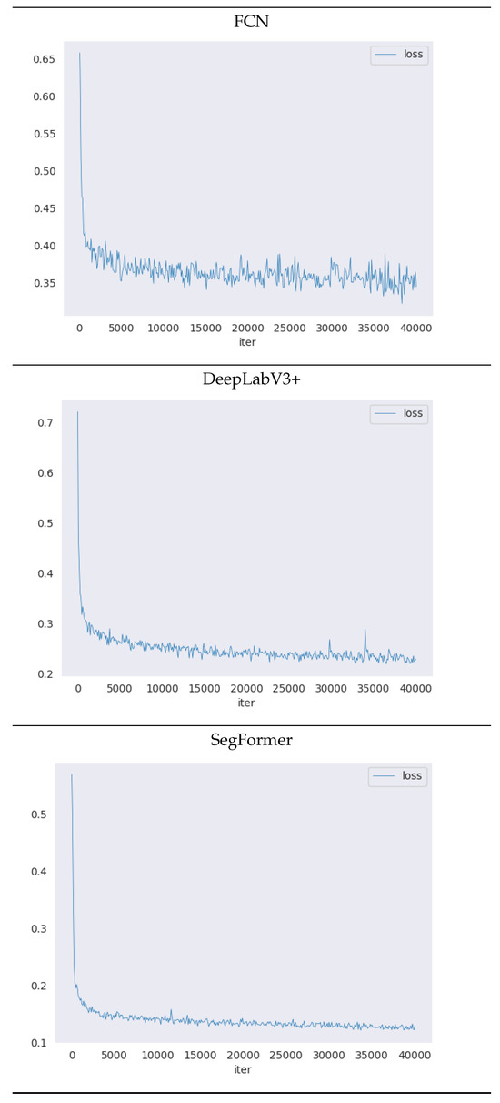 Additionally, the training process utilized the AdamW optimizer [37] for SegFormer and DeepLabv3+ models and SGD optimizer [38] for the FCN model. The learning rate was kept consistent across all training variations, set at for the SegFormer and for the alternative models. All the models underwent training for a total of 40k iterations. Furthermore, all models were trained using CrossEntropy Loss, with the weight set to 1.0 for SegFormer and DeepLabV3+ and a weight of 0.4 for FCN throughout all training sessions. The model’s performance was evaluated using the metrics accuracy and Intersection over Union (IoU) ensuring a comprehensive analysis, even for complex and imbalanced datasets.