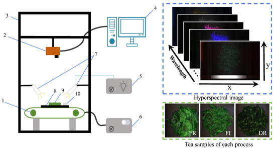 The hyperspectral camera was powered on and allowed to warm up for 15 min prior to data acquisition, a necessary step to prevent baseline drift in the spectral images, which could otherwise compromise the accuracy of the target spectrum. Calibration of the tea data was performed before the hyperspectral collection to ensure precise acquisition and eliminate potential interference. Under the same conditions as the tea samples, the light source was used to capture a dark environment image for reference. Following this, tea leaves were evenly spread on a conveyor belt for hyperspectral image acquisition. Each row scan contained 1024 pixels, with a spectral range spanning from 400 nm to 1000 nm, and a sampling interval of 0.6 nm, resulting in hyperspectral data collected at 951 wavelengths. A whiteboard was used during the process to obtain the corrected hyperspectral image of the tea. The correction principle is as follows: