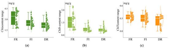 Chlb also decreased significantly during processing. It had a median of 1.66 mg/g in FL, which dropped to 0.62 mg/g after FI, a loss of about 62.65%, and further decreased to 0.56 mg/g after DR, with an overall reduction of 66.27%, which was more pronounced than the loss of