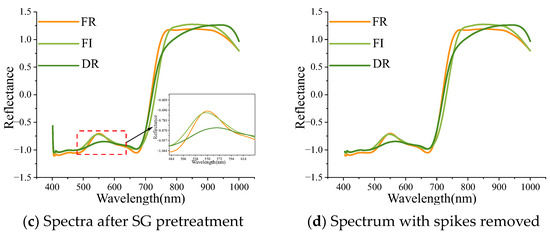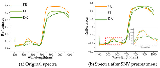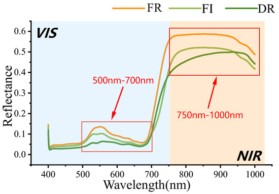 Figure 3, showing significant differences in the spectral curves of fresh leaves (FR), fixation (FT), and drying (DR). In the 500–700 nm range, notable differences in high and low reflectance are observed across the three stages, while the spectral curve of fresh leaves diverges markedly from the other two in the 750–1000 nm range, particularly between 750 and 950 nm, where FT and DR exhibit significant variation. Chlorophyll a and b absorb light primarily in the 400–500 nm and 600–700 nm wavelengths, with weak reflectance in the 500–600 nm band due to the π electron system, conjugated double bonds, and molecular structures such as benzene and pyrrole rings. These properties allow chlorophyll to absorb light at specific wavelengths, resulting in its green color [