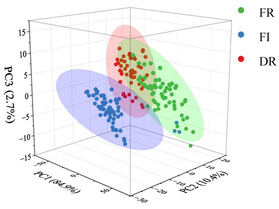 Figure 5, the spectral data of different processes were analyzed by PCA and the variance contributions were 88.62%, 8.46%, and 2.23%, respectively. The PCA shows distinct separation and clustering of the FL, FI, and FR groups in 3D space, indicating that the spectral data can effectively distinguish between different processing stages, which is critical for validating the spectral data and understanding the differences among the processes. In conclusion, the spectral reflectance of tea leaves shows significant variation across the three processing procedures, emphasizing the potential for using spectral reflectance to qualitatively distinguish tea samples at each stage.
