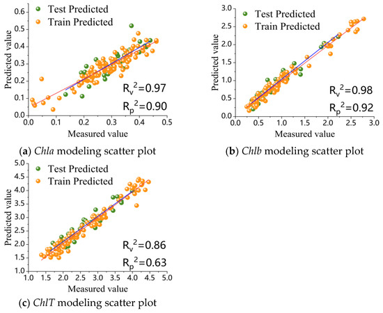 Figure 6. This excellent performance is attributed to the fact that the spectral reflectance is closely related to the pigment content, especially in the visible and near-infrared regions, where specific regions in the spectral bands can directly reflect the changes in pigment content, and the PLSR model can maximize the explanatory power of these spectral features by linear combination, which makes it possible to efficiently capture the linear relationship between the pigment content and the spectra.