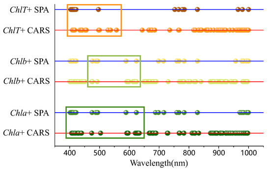 ChlT exhibit distinct patterns. Notably, the SPA selects a more limited set of characteristic wavelengths compared to the CARS algorithm. Specifically, the wavelengths identified by CARS are evenly distributed across the spectral range, providing a comprehensive representation of the pigments’ spectral characteristics. In contrast, the SPA’s selection is marked by an uneven distribution and a smaller number of bands, which may undermine the model’s predictive accuracy. This uneven selection of bands likely contributes to the reduced predictive effectiveness observed when using the SPA to build models.
