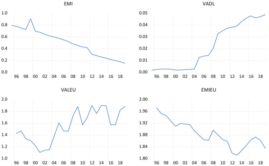 The evolution of the model variables for the time period studied. EMIL denotes CO2e for LDCS. EMIEU denotes CO2e for EU. VAL denoted value added by agriculture for LDCS. VADL2 denoted the square value added by agriculture for LDCS. VAEU denoted value added by agriculture. VAEU2 denoted value added by agriculture.