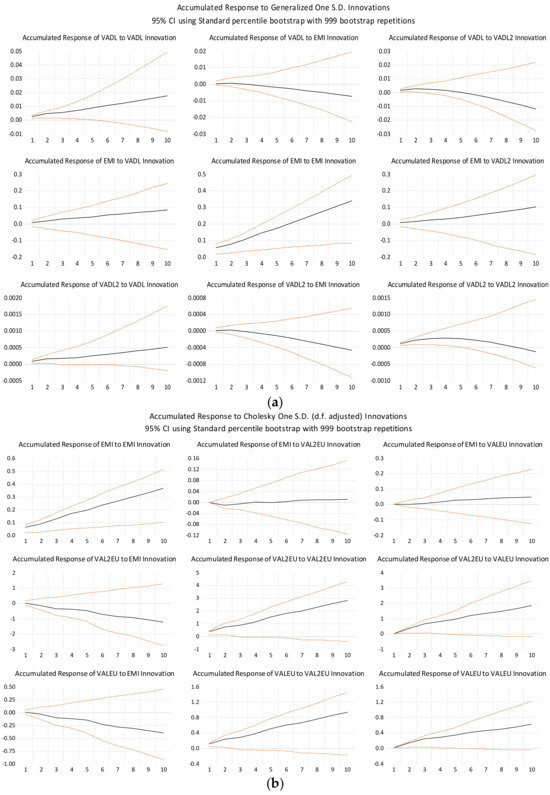The last step in our analysis involves the impulse response function estimation (IRF) for each variable as well as the Forecast Error Variance Decomposition analysis (FEVD). The impulse response analysis is a significant tool in econometric analysis, since it may well describe the evolution of the estimated VAR model’s variables as a response to a shock in one or more variables. In other words, this step allows the analyst to trace the transmission of a single shock within the noisy system of equations and, therefore, we can make an assessment of the economic policy impacts in the model variables’ evolution within a period that may be 10 or 20 years in cases where the data employed are annual [43,44,45]. In a similar vein, Variance Decomposition or, in other words, Forecast Error Variance Decomposition is a specific tool that may interpret adequately and, in a narrow way, the relations between variables described by the model estimated. This methodology will amplify the impulse response analysis since it further quantifies the contribution rates of all variables to the impact on the dependent variable [46,47,48].