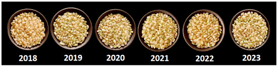 The samples were selected from mature japonica rice varieties provided by the Rice Research Institute of the Jilin Academy of Agricultural Sciences (JASA), and the variety was “Dongdao 12” [16]. The origin of the rice was the research land of Gongzhuling Rice Research Institute (43°30′16.85″ N, 124°49′22.08″ E), Jilin Province, and the harvest years of the samples were 2018, 2019, 2020, 2021, 2022, and 2023, and the rice samples of each year were dried and preserved at low temperatures.