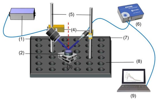 Fluorescence Spectrometer Diagram. 1. Light source; 2. Sample cuvette; 3. Two-dimensional moving platform; 4. Connecting rod; 5. Stand; 6. Spectrometer; 7. Light probe; 8. Optical platform; 9. Computer.