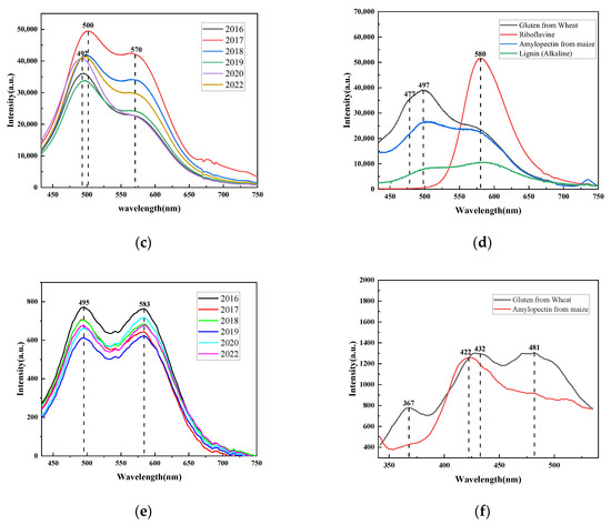 Fluorescence spectra of the tested samples at different excitation wavelengths: (a) brown rice of different years, Ex = 405 nm; (b) gluten from wheat, riboflavin, lignin, and amylopectin from maize, Ex = 405 nm; (c) brown rice of different years, Ex = 365 nm; (d) gluten from wheat, riboflavin, lignin, and amylopectin from maize, Ex = 365 nm; (e) brown rice of different years, Ex = 310 nm; (f) gluten from wheat, amylopectin from maize, Ex = 310 nm.