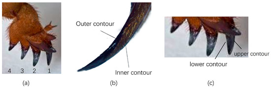 Claw toes and longitudinal and transverse sections of the forefoot of a mole cricket: (a) four toes of the forefoot of a mole cricket; (b) longitudinal section (Gao, 2009) [29]; (c) cross-section.