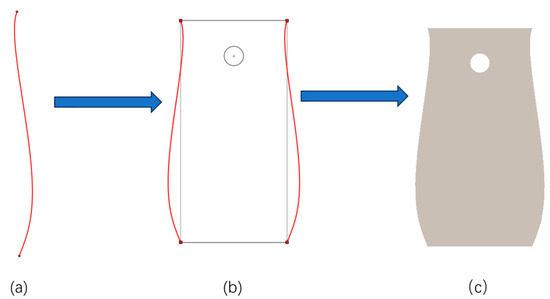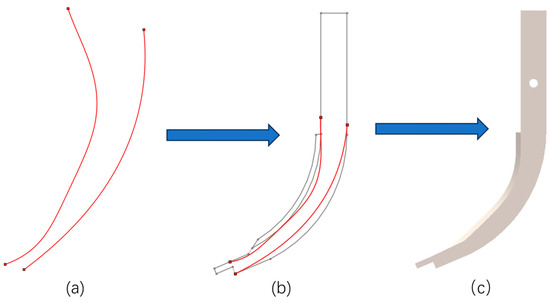 The inner and outer contour function expressions from the longitudinal section of the four toes of the mole cricket forefoot were imported into SolidWorks 2020, as detailed in Table 1 and Table 2 [30,31], to generate sketches of their inner and outer contour curves. For the purpose of comparing the bionic subsoiling shovel with the common subsoiling shovel, these sketches underwent preprocessing in CAD 2020, involving the scaling and rotation of the inner and outer contour curves, respectively. While ensuring that the overall dimensions of the two are approximately the same, the contour curve of the mole cricket claw toe replaced the contour curve of the operating part of the common subsoiling shovel. After processing, it was reintroduced into SolidWorks 2020 for tensile modeling to ultimately obtain the contour curve of the bionic shovel handle. The process of establishing the shovel handle of the bionic subsoiling shovel 1 is shown in Figure 2.