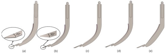 The end chamfer of the shovel tip was optimized from 20° to 30° by combining the tip portion of the claw toe from the mole cricket’s forefoot [18]. Finally, the shovel tip, shovel handle, and connecting parts were assembled to obtain the simplified side view of both the common subsoiling shovel and the bionic subsoiling shovel, as shown in Figure 5.