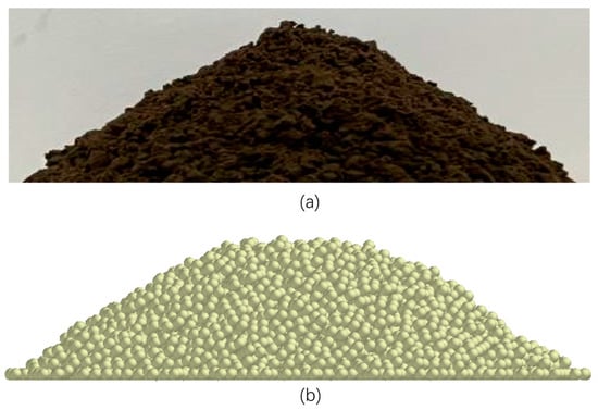 Utilizing Design-Expert software, with a soil accumulation angle of 36.25° as the standard, multi-objective solution was performed on the parameter set of the quadratic regression model function values. A set of data was obtained: a soil–soil collision recovery factor of 0.27, a soil–soil static friction factor of 0.45, a soil–soil rolling friction factor of 0.01, and a soil JKR surface energy of 2.03 J/m3. The corresponding simulated accumulation angle was 36.56°, with a relative error of 0.8552% compared to the actual accumulation angle, indicating that the soil microparameters are basically consistent with the actual ones and can be applied to the dynamic analysis of relevant soil models. Figure 7 shows the comparison between actual and simulated stacking images, indicating that the soil model of the cultivated layer established using the obtained parameter set is accurate and reliable.