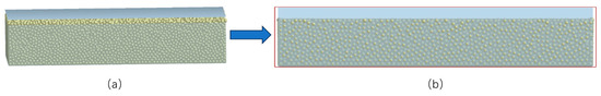 Due to the low moisture content, small porosity, and high degree of slaking in the plow pan soil, strong interparticle forces are present. Therefore, the Hertz–Mindlin model with bonding contacts was selected as the contact model for the plow subsoil. To simulate the plow subsoil more accurately, an extrusion plate was placed at the soil slot entrance. After a thickness of 20 cm is generated in the plow subsoil, the compression plate is controlled to move downwards by 3 cm, moderately compacting the subsoil, as depicted in Figure 8.