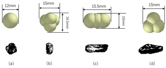 The tillage layer typically refers to the soil layer located 15–20 cm below the surface, characterized by loose texture and higher water content. The Hertz–Mindlin model with JKR contact was selected as the appropriate contact model for the tillage layer soil. Soil particles in the tillage layer often exhibit bulky, strip, flaky, and columnar appearances [34]. The shape of soil particles plays a crucial role in soil modeling. Therefore, in EDEM 2020, single spherical particles, a tetrahedral combination of four spherical particles, a linear combination of three spherical particles, and a triangular combination of three spherical particles were employed to simulate bulky, columnar, strip, and flaky soil particles in the actual tillage layer, depicted in Figure 9.