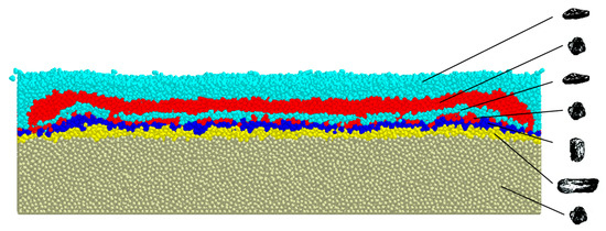 In view of the complexity and differences of the shape of soil particles in the tillage layer, the tillage layer was divided into six layers, and the shape of the particles from the surface to the inside were flaky, bulky, flaky, bulky, column, and strip, and the number of simulated soil particles is set based on the size of the simulated soil tank and the operating speed of the computer. The distribution of the soil particles in each layer is shown in Figure 10.