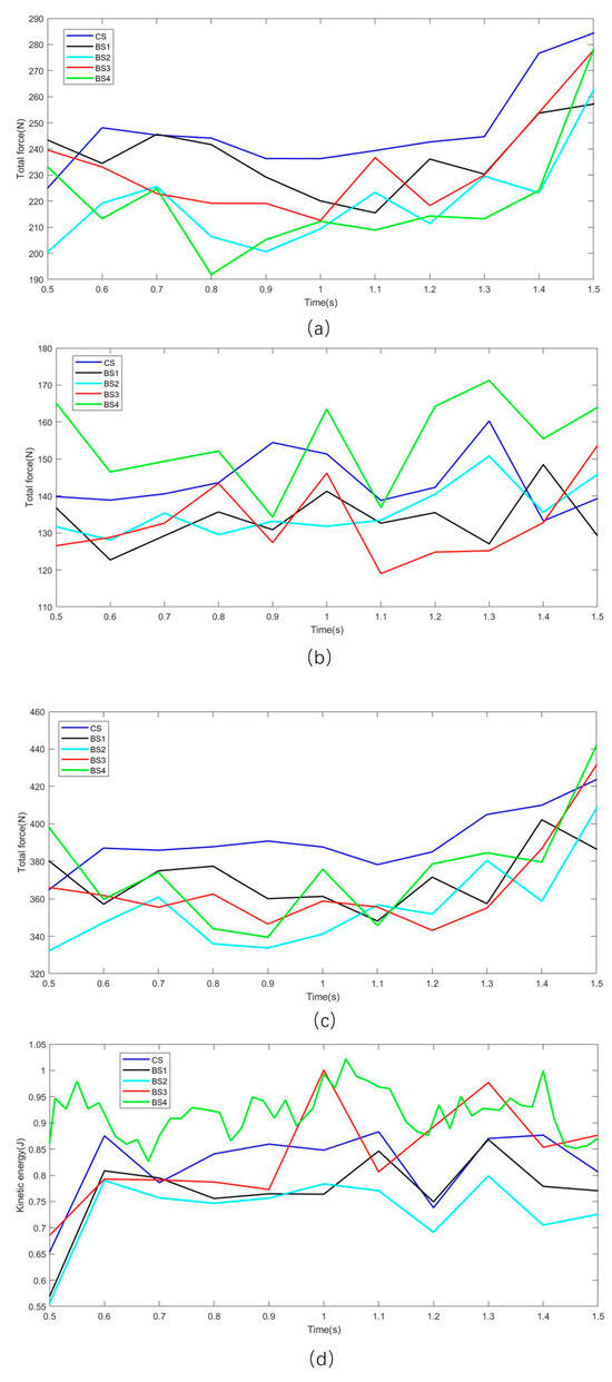 The kinetic energy variation of soil particles was obtained, as illustrated in Figure 11d. From Figure 11d, under the action of BS4, the kinetic energy of soil particles is significantly highest; under the action of BS3, the peak kinetic energy of soil particles is greater than that of CS, while under the action of other bionic subsoiling shovels, the kinetic energy of soil particles is significantly lower than that of CS. For the convenience of analysis, the average kinetic energy corresponding to each sampling time point in the stable working stage was calculated, as shown in Table 10. The average soil particle kinetic energies caused by CS, BS1, BS2, BS3, and BS4 are 0.822 J, 0.770 J, 0.735 J, 0.840 J, and 0.931 J, respectively. The energy consumptions of BS1, BS2, BS3, and BS4 are 6.33%, 10.58%, 0.49%, and −14.37% lower than that of CS, respectively. It can be seen that BS1, BS2, and BS3 all have energy reduction effects, and BS1 and BS2 can effectively reduce the energy consumption of deep loosening equipment. Although BS4 exhibits a certain resistance reduction effect, it consumes more energy.