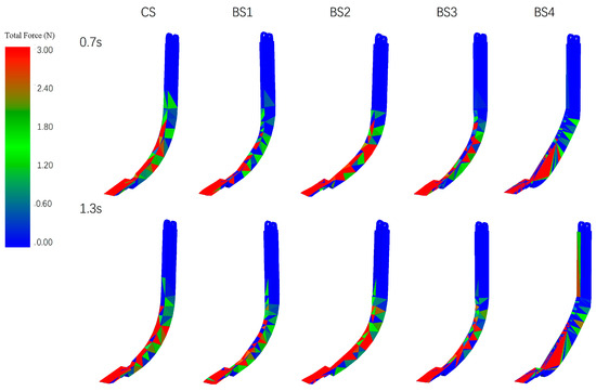Further visual analysis of the tillage resistance on five types of subsoiling shovels was conducted on the EDEM 2020 post-processing interface. Take the cloud maps of the tillage forces acting on five types of subsoiling shovels at 0.7 s and 1.3 s, respectively, to represent the force situation during stable operation, as shown in Figure 12. The color represents the magnitude of the tillage force acting on the subsoiling shovel, with red representing the maximum force, followed by green, and blue the minimum.