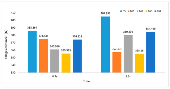 Given that the tip of BS2 demonstrated the most effective resistance reduction, it was combined with the handle of BS3, which had the best resistance reduction effect, to form a bionic subsoiling shovel 5 (BS5). BS5 underwent the same subsoiling simulation, and the average tillage resistance at each sampling time point during stable operation was calculated, as depicted in Table 10.