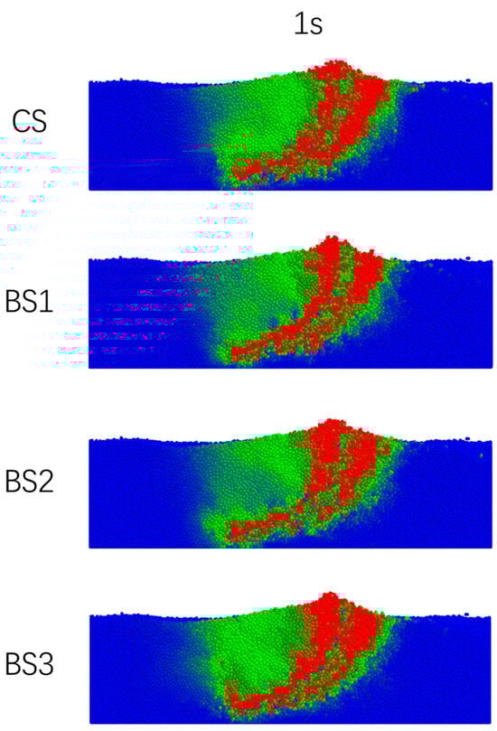 A select velocity cloud diagram of four types of subsoiling shovels disturbing the soil model at 1 s is illustrated in Figure 14. Colors indicate velocity magnitude, with red being the highest, green intermediate, and blue the lowest. In Figure 14, the red area of the soil velocity streamlines for BS1 is smaller than that of CS; BS1 and BS2 exhibit a smaller green area in the soil velocity streamlines compared to CS. Combined with Table 10, it indicates that the reliability of the experimental analysis is high and highlights the energy-saving benefits of BS1 and BS2.