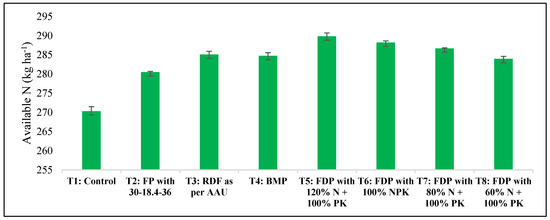 The effect of different fertilizer management practices on soil available N (kg ha−1), P2O5 (kg ha−1), and K2O (kg ha−1) after harvest of the crop was significant (Figure 3). The highest available N, P2O5 (kg ha−1), and K2O (kg ha−1) were obtained in FDP with 120% N and 100% PK. Regardless of nitrogen level, fertilizer application through deep placement of NPK briquettes resulted in comparatively higher available soil N, P2O5, and K2O than conventional methods. The control plot recorded the lowest values.