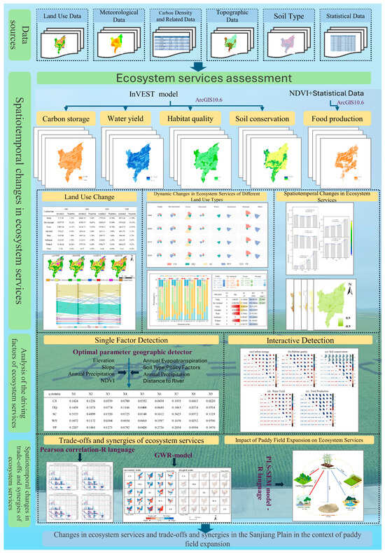 In this study, we first assessed land use changes and five key ESs in the SJP by integrating multi-source data. Next, we analyzed the main factors influencing ESs. Finally, we explored the TOS between ESs and evaluated the impact of paddy field expansion on ESs. The detailed workflow of this study is shown in Figure 1.